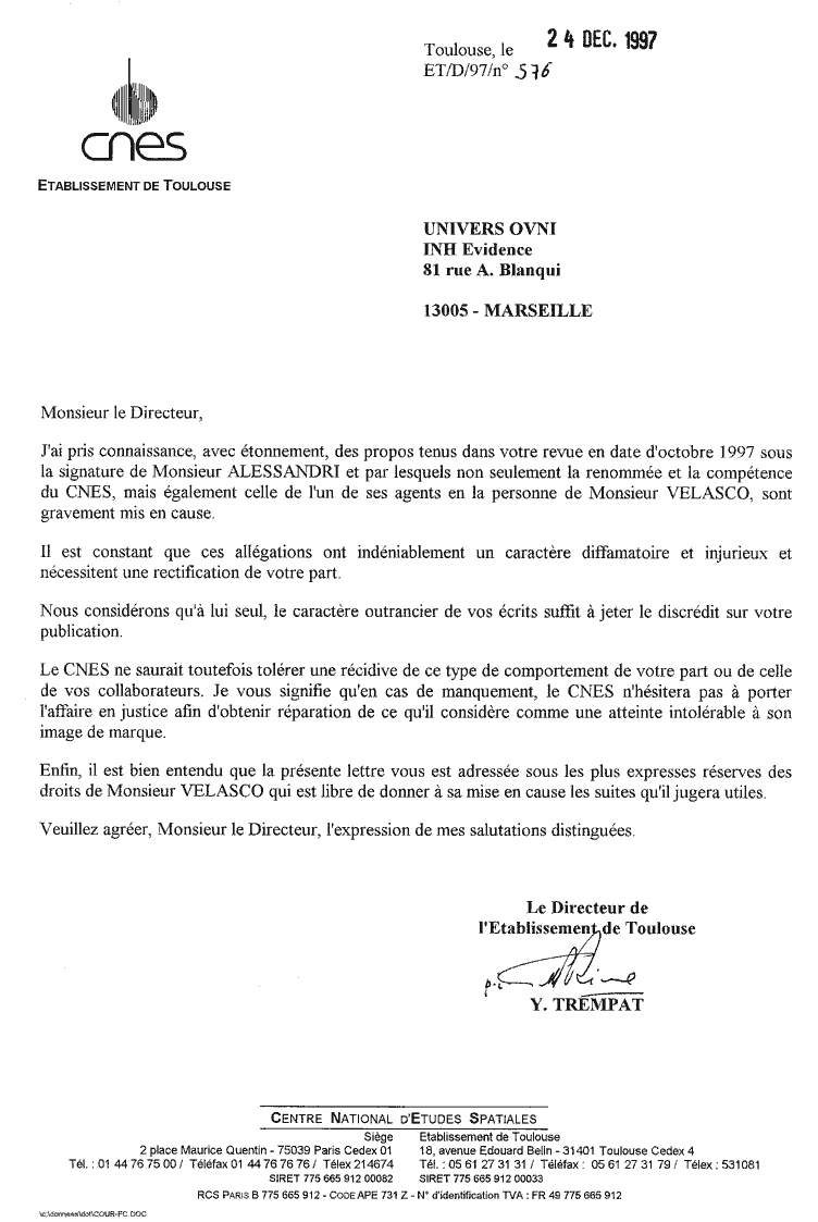 courrier du 15 janvier 1998). Le courrier du CNES soutenant son protégé