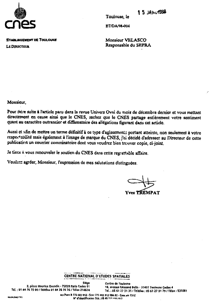 courrier du 15 janvier 1998). Le courrier du CNES soutenant son protégé