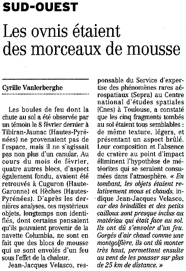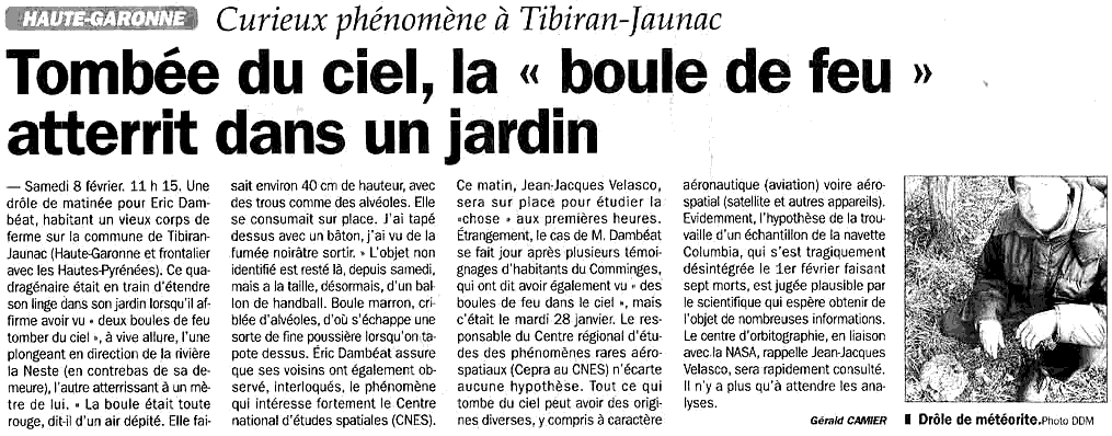 8 février 2003 : Un morceau de navette à Tibiran-Jaunac ?